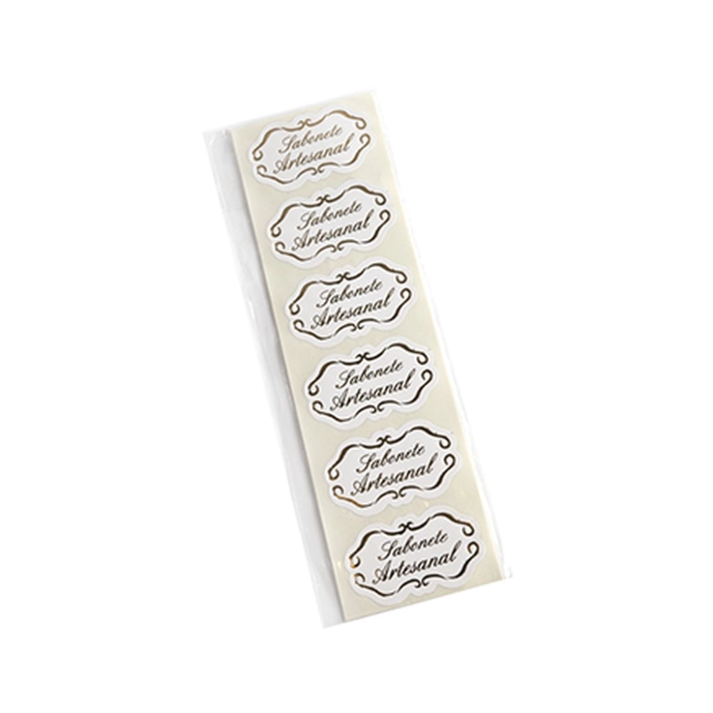 Etiqueta adesiva de papel couchê com impressão dourada. Pacote com 50 etiquetas.
